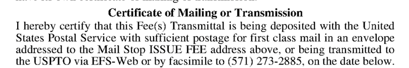 The “Certificate of Mailing or Transmission” on the Part B – FEE(S) TRANSMITTAL form for transmittal of an Issue Fee does not list transmission to USPTO via Patent Center.