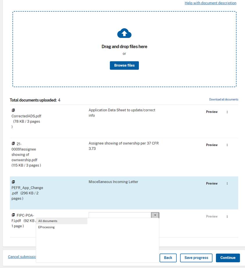 Unfortunately, you are really limited by the names of the file types. I needed to file a request to correct applicant, show ownership and correct the ADS. I had to name several of the documents, miscellaneous incoming letter, and transmittal letter, including for the POA.