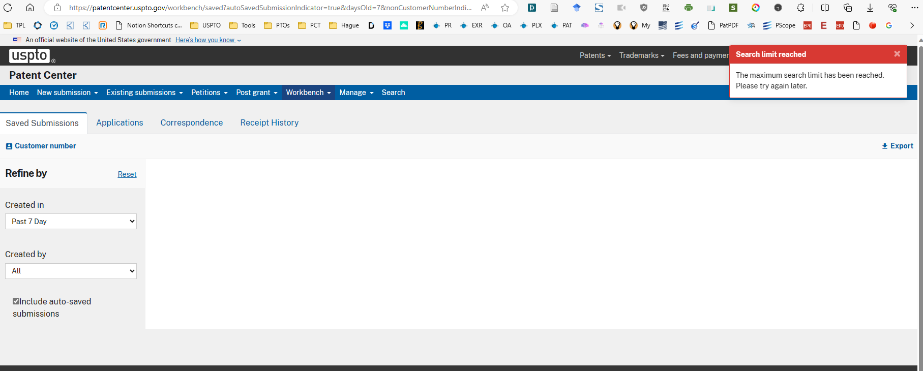 [Patentcenter] Cannot access saved submissions on Workbench on PatentCenter