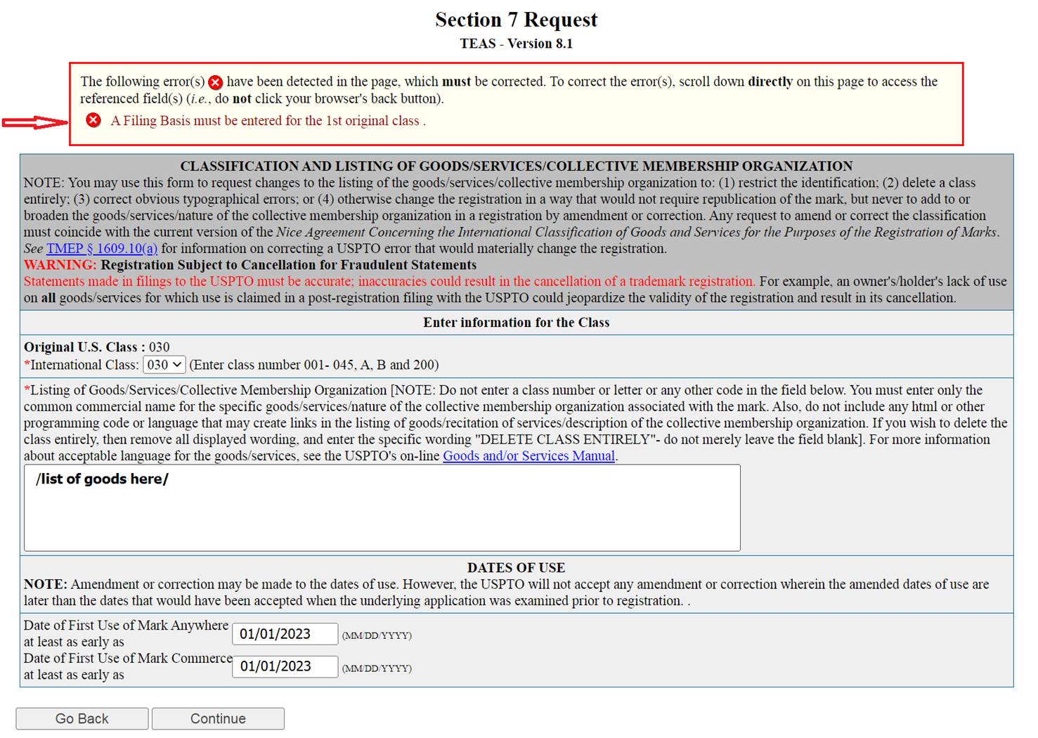 Below is the page where the dates of first use can be corrected. I did so. I did not touch the list of goods. When I click on the Continue button, I get an error message as in the screen shot below. Nowhere on that page is there a place that even shows the filing basis for the original class, neither is there a place to enter a filing basis (I don’t even understand why it would be needed, I am not correcting the basis or the list of goods).