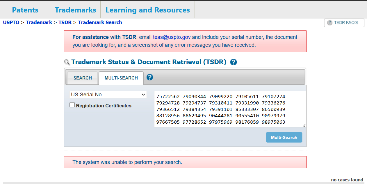 FYI - Significant problems with both TSDR and Trademark Search this morning. See my alert to the USPTO below. I did freshly boot my laptop this morning, but I'll be rebooting to see if performance improves. Happy ❤ VD!