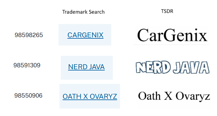 I recommend correcting the mark drawing codes of these 17 trademark records ASAP. For most of these, the standard character drawing code is appropriate, but for 98591309 (pictured above), perhaps the stylized text mark drawing code would be more appropriate.