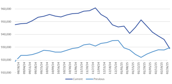 Curiously, both plots were trending upwards for September to Thanksgiving. The plots crisscross for the end of February, except the pending counts were trending upward in 2024 but trending downward in 2025.