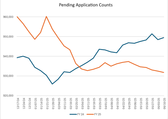 The plot below shows the counts of pending applications on Tuesdays for the last 6 months (FY 25) and the corresponding counts of pending applications on Tuesdays last year (FY 24). Note the upward spike for FY 25 as the date of the new application fees approached in mid-January, then the general decline of pending applications since January 18th. Contrast that with the trend for FY 24, when pendng application counts generally rose from late January through early June.