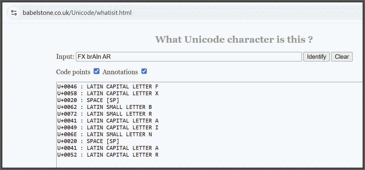 You open up this Unicode decoder <https://www.babelstone.co.uk/Unicode/whatisit.html> and you get ready to use it. But next, open a new browser window and click on the TSDR page <https://tsdr.uspto.gov/#caseNumber=99407734&caseType=SERIAL_NO&searchType=statusSearch> , click on "documents", click on "application", scroll down to the "mark description". Copy the mark description which is "FX brAIn AR" and paste it into the Unicode decoder. Click on "identify". What you will see on your own computer screen is this: