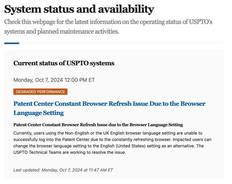 > https://www.uspto.gov/system-status/20241007-patent-center-constant-browser-refresh-issue-due-browser-language-setting