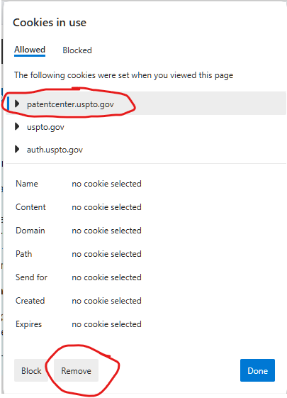 When I get the 401 error, I click on the little lockbox (I'm in Edge) in the URL bar and delete only the cookie for patent center. I then go to https://patentcenter.upsto.gov<https://patentcenter.upsto.gov/> and it almost always automatically logs me back in (sometimes I have to click Sign in and then it automatically logs me in).
