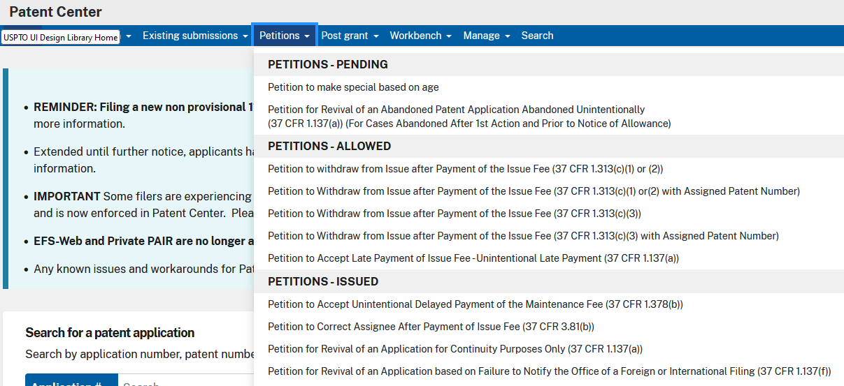 > If you’re asking about the ePetitions, they are available in Patent Center