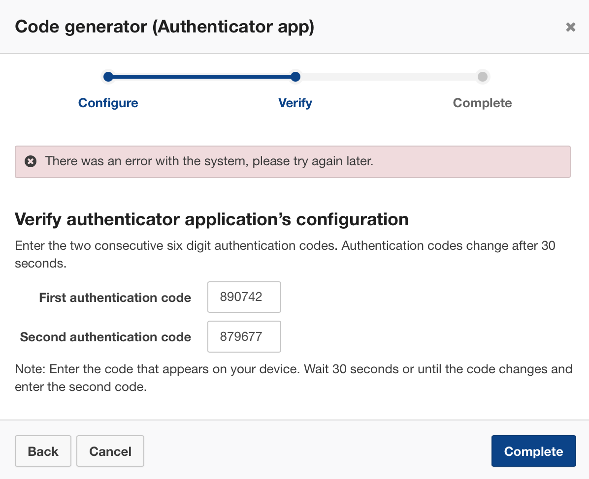 But when I try to authenticate it, I get “There was an error with the system, please try again later.”