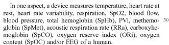 Regarding claim 4, Khachaturian discloses the biometric system of claim 1, wherein the physiological data is selected from the group consisting of a cardiac activity, a muscular activity, a galvanic skin response, an electrophysiological activity; a temperature, a blood pressure, a glucose level, an oxygen saturation, a nitric oxide level, a vasodilation level, an extravascular fluid condition, a physical balance, a muscular coordination, a physical exhaustion, an endurance limit (In one aspect, a device measures temperature, heart rate at rest, heart rate variability, respiration, SpO2, blood flow, blood pressure, total hemoglobin (SpHb), PVi, methemoglobin (SpMet), acoustic respiration rate (RRa), carboxyhemoglobin (SpCO), oxygen reserve index (ORi), oxygen content (SpOC) and/or EEG of a human(col. 1, lines 28-33)).