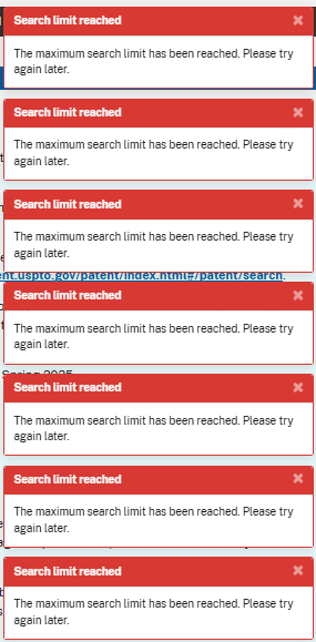 A third bad thing about this is the USPTO developers carrying on their by now well-established tradition (see trouble ticket CP34<https://patentcenter-tickets.oppedahl.com/#CP34> reported in the year 2020) of picking the wrong words for important parts of the PC user interface. Here, the developers characterize the bad thing that happened as a "Search Limit" that was "reached". But Suzannah was not "searching" at all. She was looking at the documents page for one of her own patent applications (in which she had paid thousands of dollars' worth of government fees). And she was clicking to view or download a document from that patent application. She was not "searching" at all. There should be no "limit" on the activity of a paying customer clicking on a document in the customer's own application file.