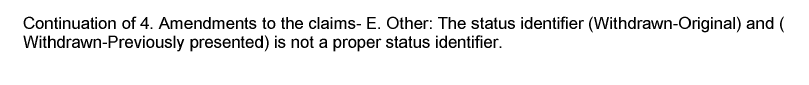 The Office may also accept additional variations of the status identifiers provided in 37 CFR 1.121(c)<https://www.uspto.gov/web/offices/pac/mpep/mpep-9020-appx-r.html#d0e323020> not listed above if an Office personnel determines that the status of the claims is accurate and clear. When accepting alternative status identifiers, the examiner is not required to correct the status identifiers using an examiner’s amendment. Applicant will not be notified and will not be required to submit a corrective compliant amendment. The examiner does not need to make a statement on the record that the alternative status identifiers have been accepted.